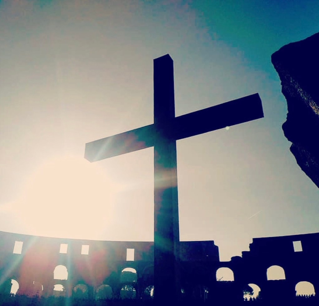 This photo was taken on a sunny day in 2018 at the Coliseum in Rome. Charlene had gone off to find a bathroom and while I waited, sitting with my back against a stone wall, I looked out at this giant cross. A man crossed in front of me and, after admiring it for a few seconds, he raised his arms straight out and turned his face toward the sun.